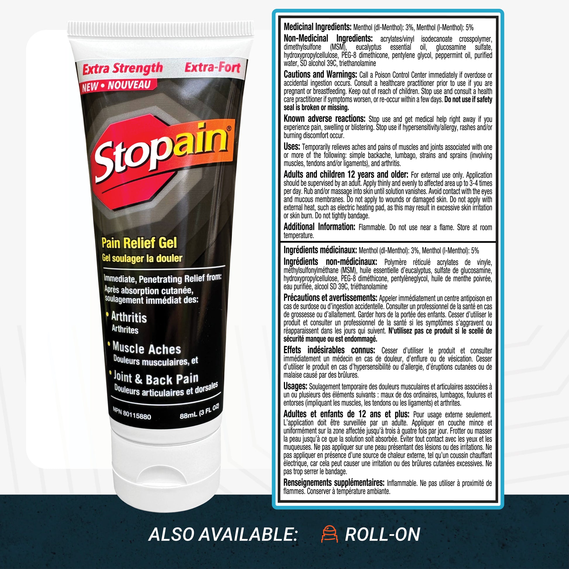 Stopain® Extra Strength Gel delivers immediate, penetrating pain relief formulated with 8% Menthol to soothe sore, aching muscles and joints. Simply massage in with your fingertips for powerful, long-lasting relief without any greasy residue.