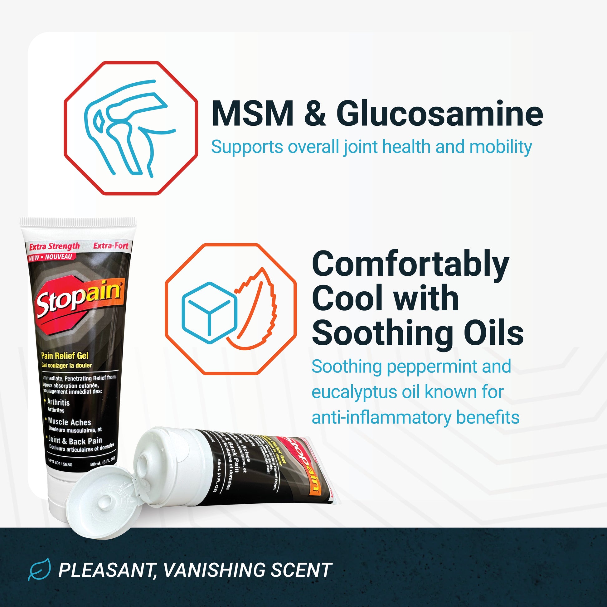 Stopain Extra Strength Gel delivers fast relief. Formulated with the proven pain-relieving benefits of menthol. It also contains MSM and Glucosamine -- essential ingredients long known for their ability to help reduce joint pain and arthritis pain. Clear gel with penetration enhancers works on contacts, light vanishing scent, and non-greasy.
