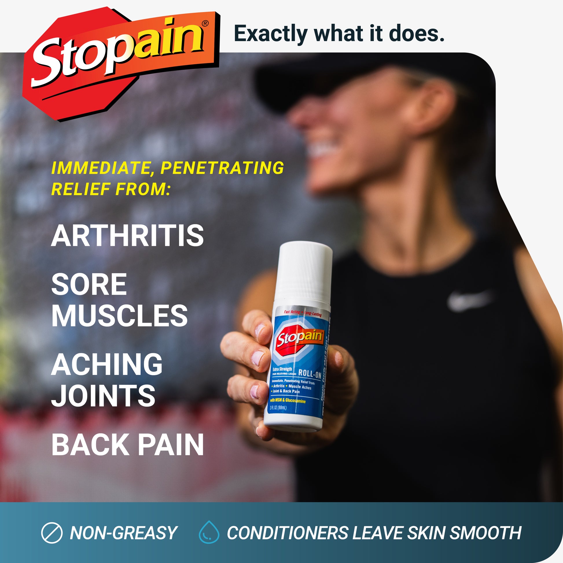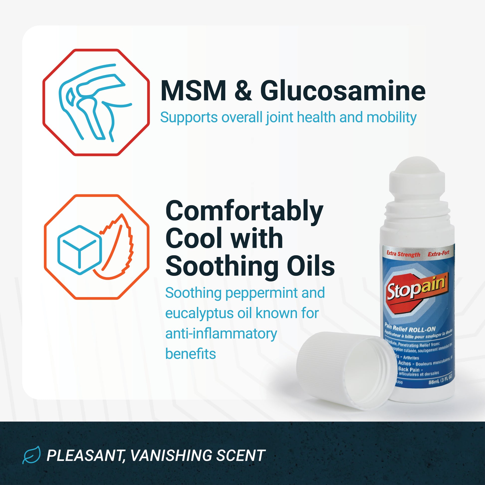 Stopain Extra Strength Roll-On delivers fast relief. Formulated with the proven pain-relieving benefits of menthol. It also contains MSM and Glucosamine -- essential ingredients long known for their ability to help reduce joint pain and arthritis pain. Works fast, keeps hands clean, light vanishing scent, non-greasy, easy to use, and works on contact.
